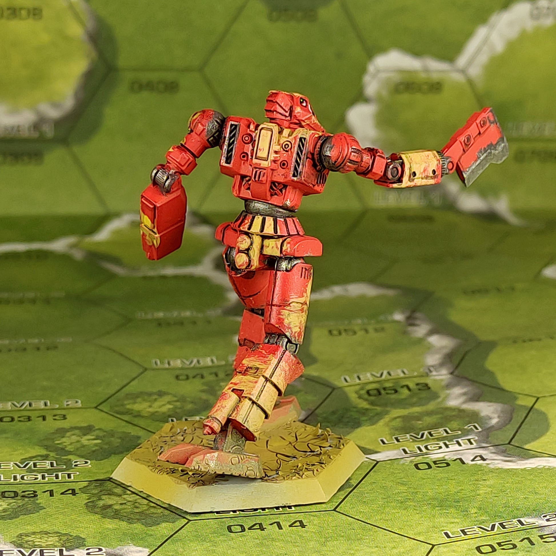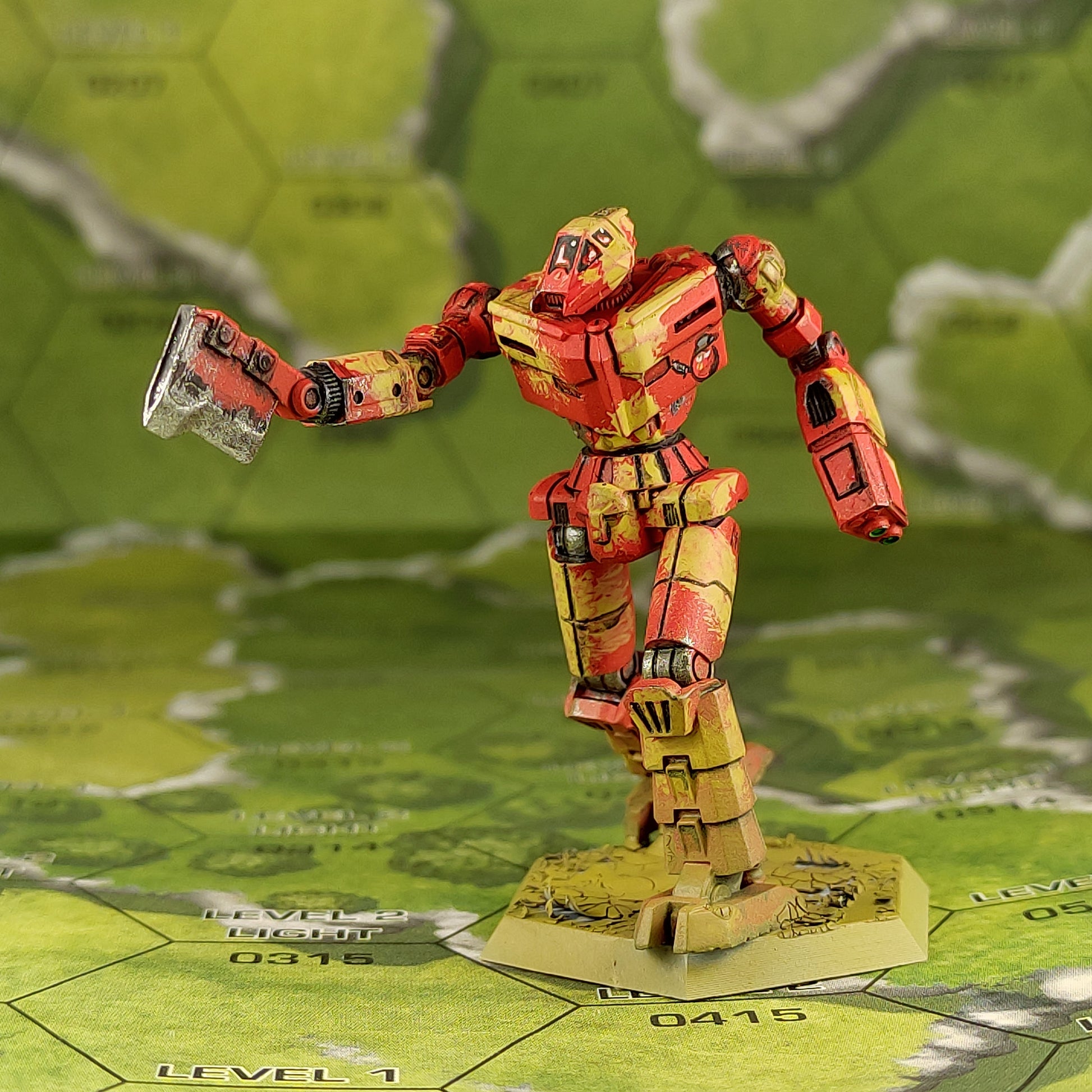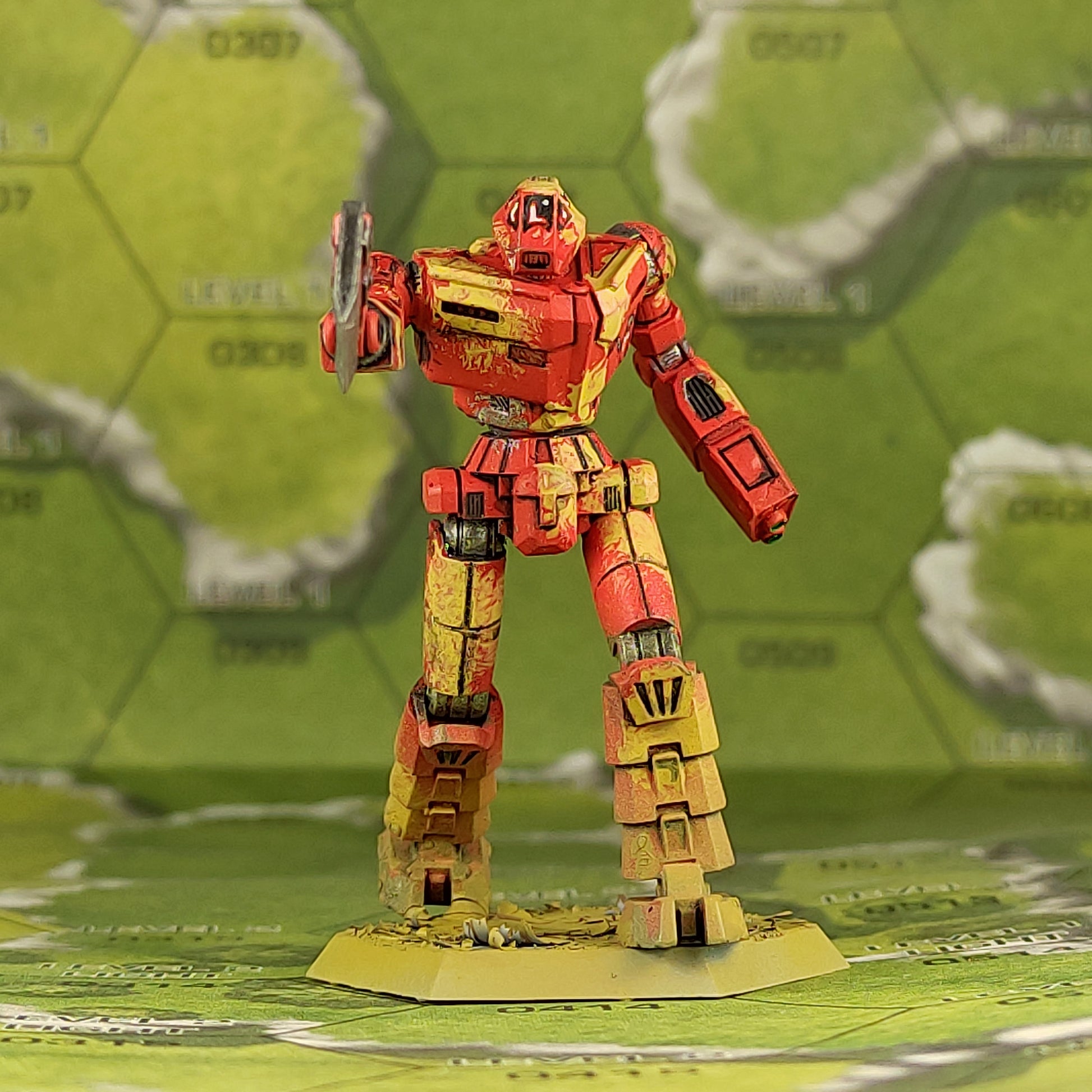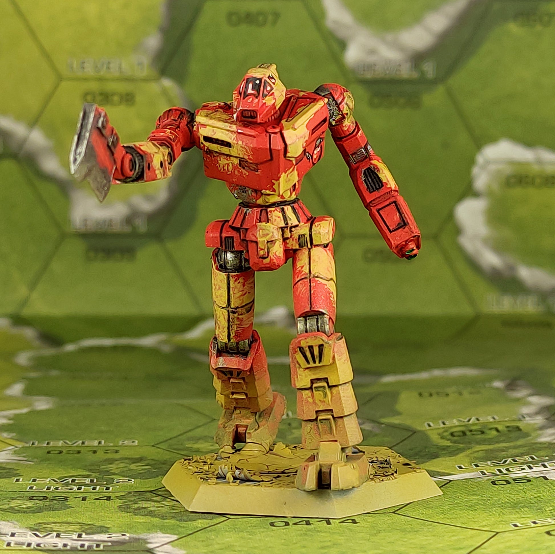 Fast lightweight mech with an abundance of electronics. The ax says I'm coming to you. The arms are divided into elements for easy positioning.